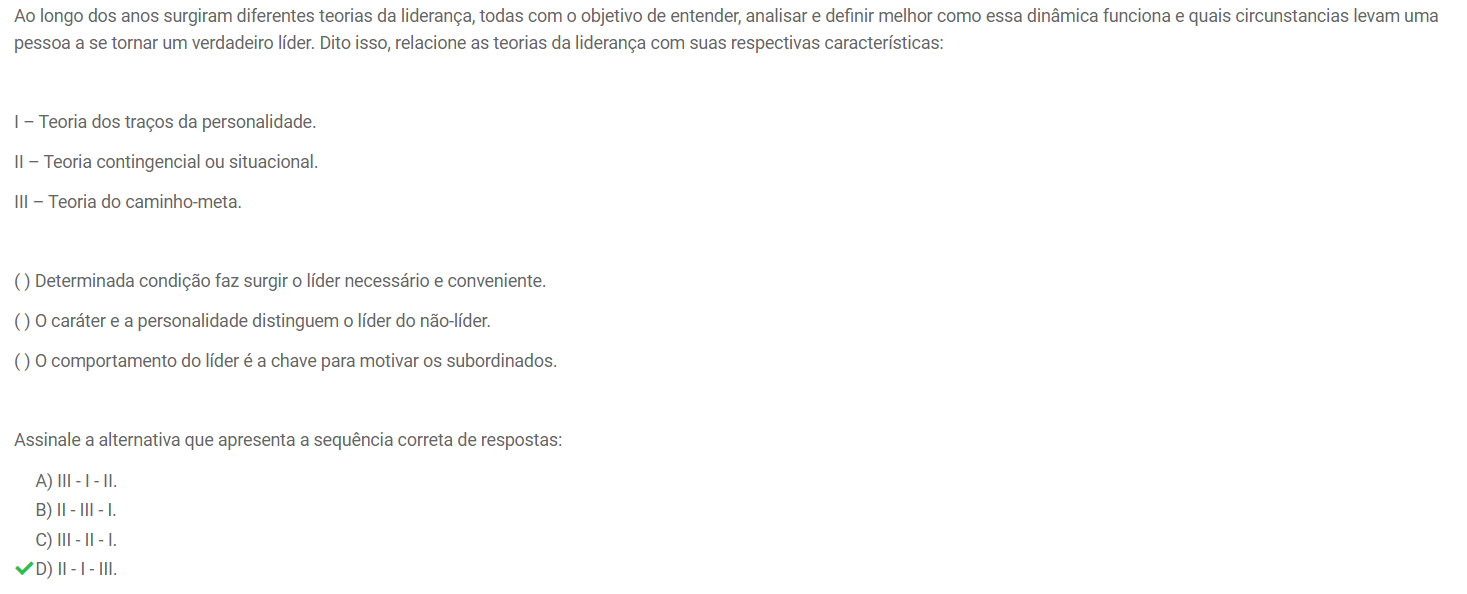 Sobre as teorias da liderança e suas respectivas características a sequência correta II - I - III.No que tange a teoria contingencial ou situacional, dos traços da personalidade e do caminho-meta. Letra B.. Teorias da Liderança. II - Teoria contingencial ou situacional: Essa teoria sugere que a eficácia do líder depende das condições situacionais, ou seja, há diferentes estilos de.