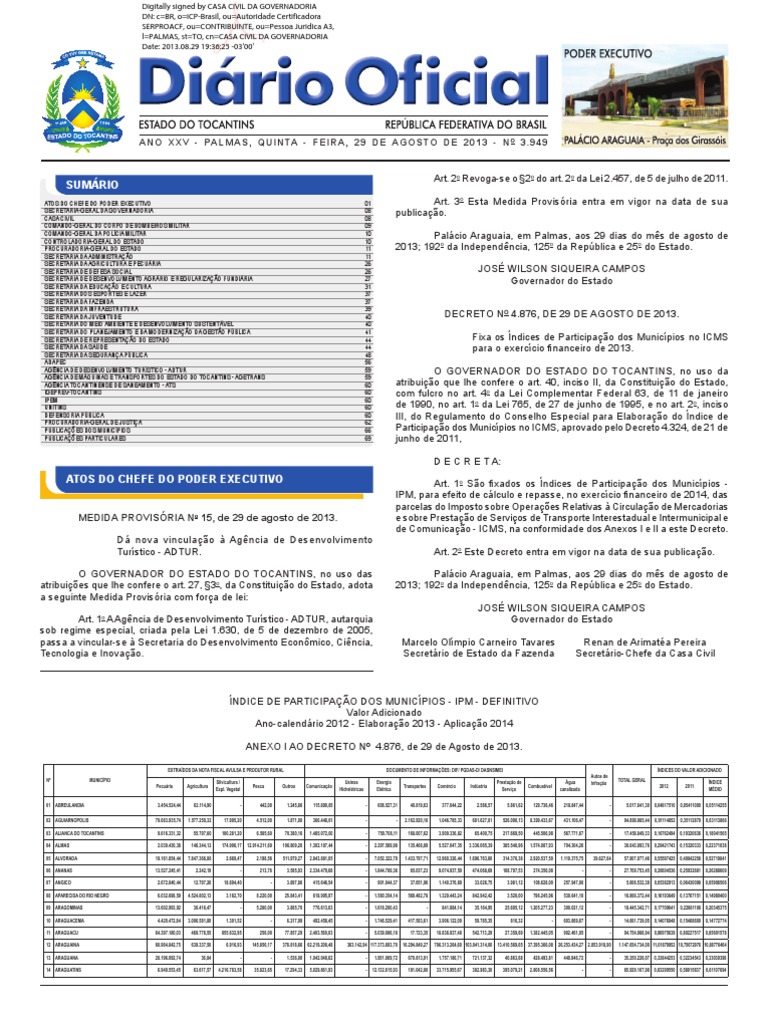 Sumário Ano Xxv Palmas, Quinta Feira, 29 De Agosto De 2013 N 3.949 República Estado
