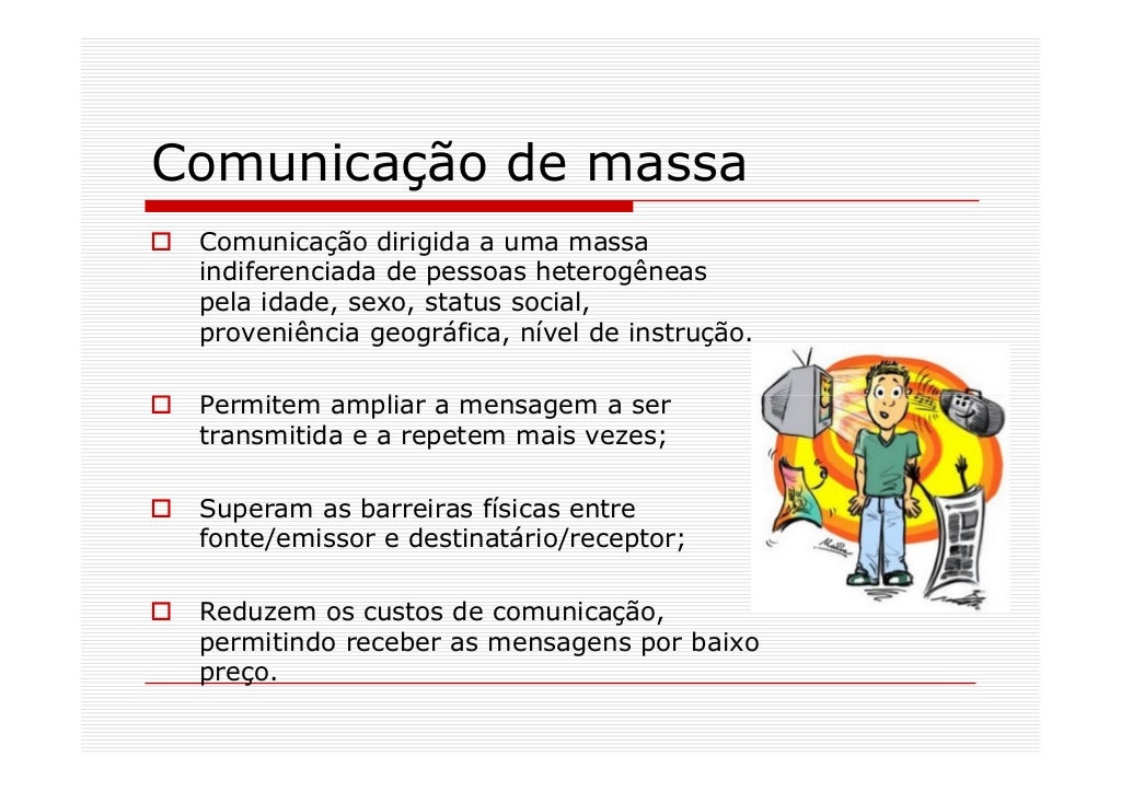 Bruna Luzardo dos Santos. ·. Follow. 8 min read. ·. Feb 7, 2018. Entende-se como comunicação em massa, a disseminação de informações por meio de jornais, televisão, rádio, revistas, internet e.