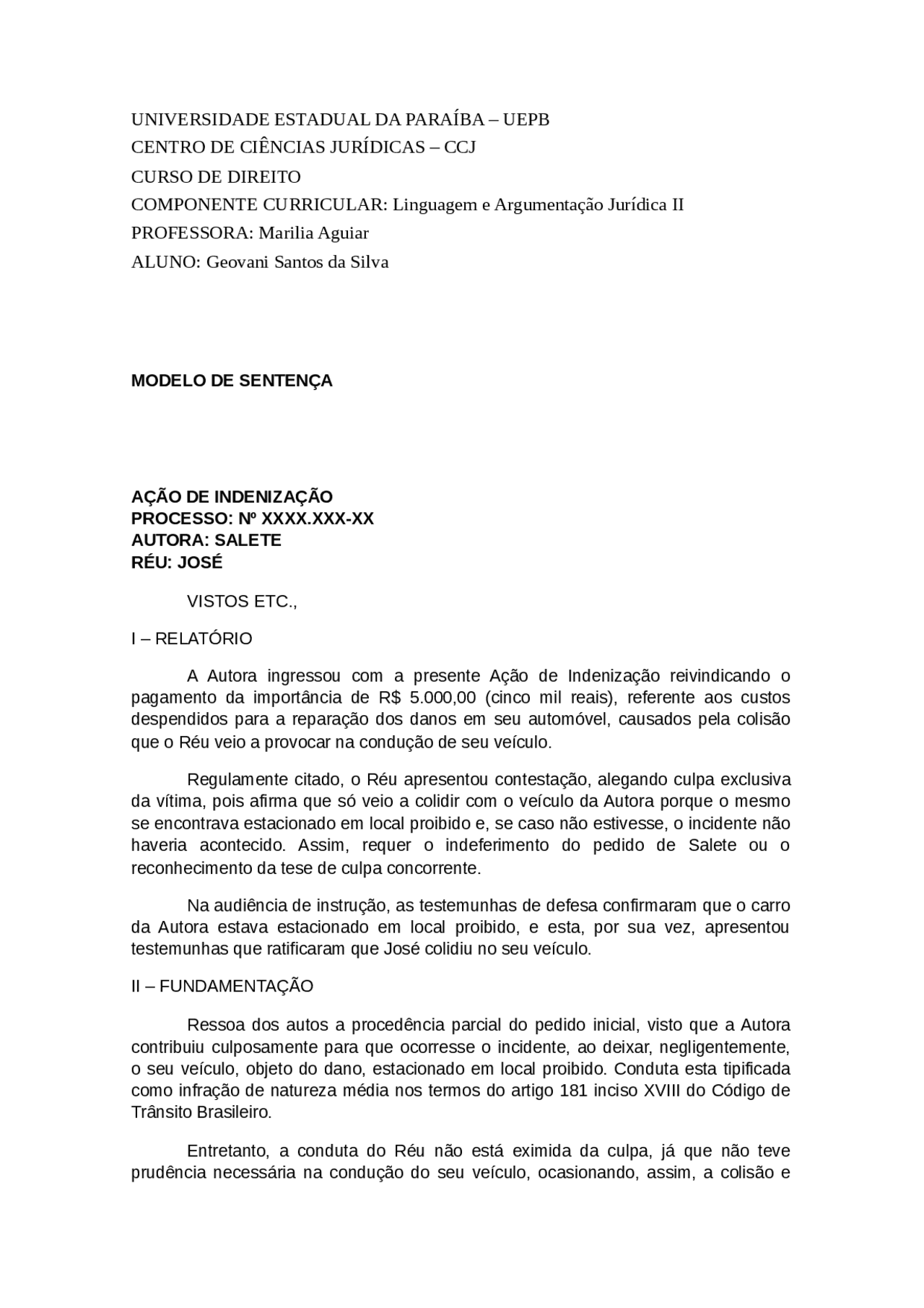 Modelo de Sentença Modelo de Senteça produzido a partir de um caso fictício. Docsity