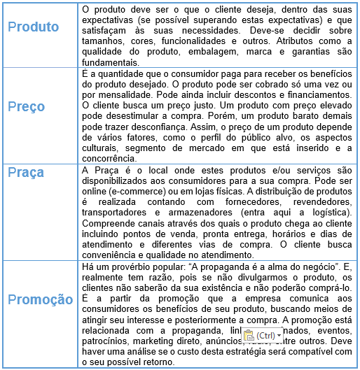 O conceito dos 4P's do marketing, também chamado de Mix de Marketing, almeja resumir os quatro elementos básicos que integram a estratégia de marketing da sua empresa. Esses elementos são: Produto, Preço, Praça e Promoção. Cada um destes componentes será responsável por definir qual caminho o marketing do seu negócio irá tomar.