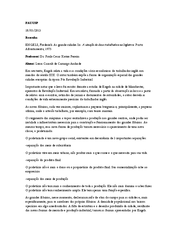 (DOC) Fichamento ENGELS, Frederich. As grande cidades In A situação da classe trabalhadora na